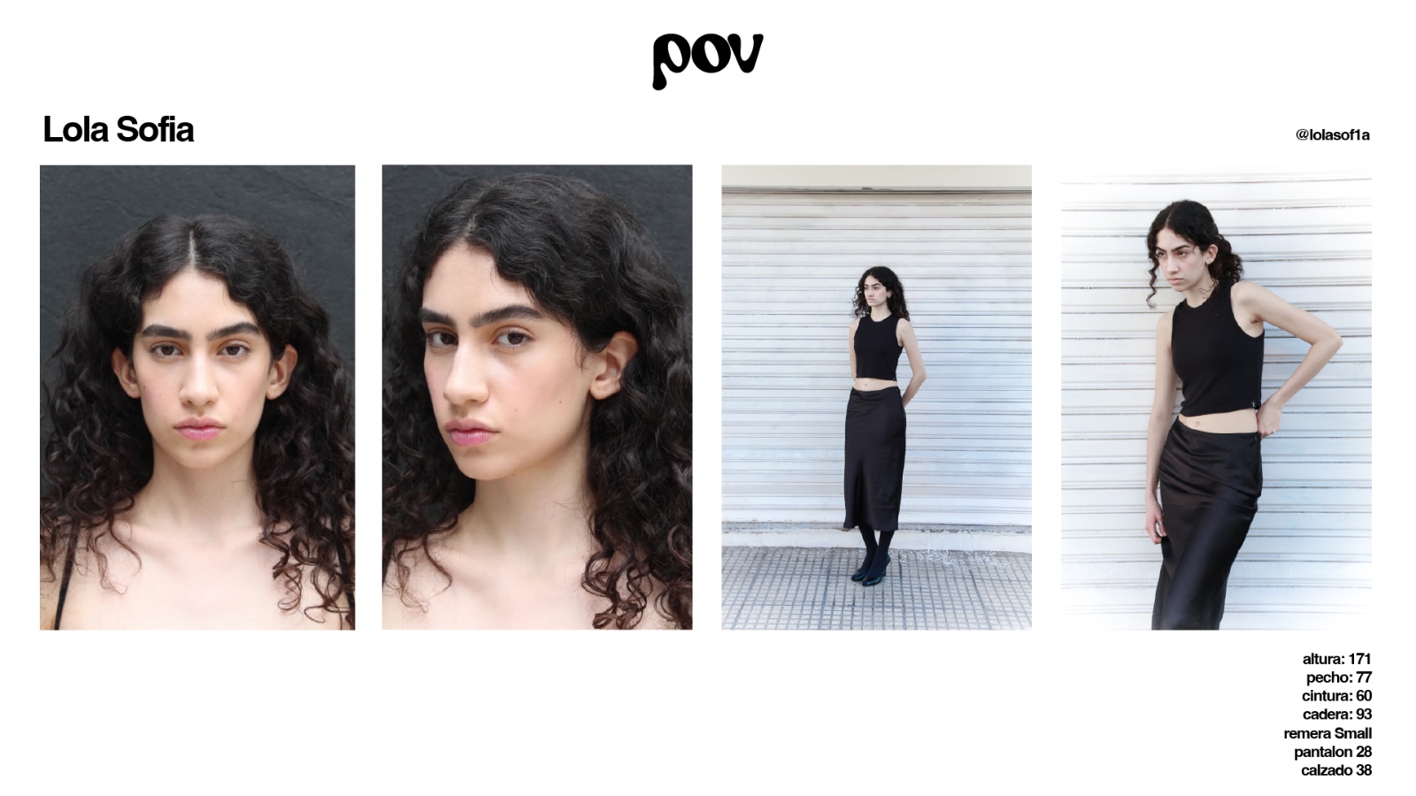 Height:1.71 Bust:77 Waist:60 Hips:93 Top:Small Pant:28 Shoe size:38 Hair:Black Eyes:Brown